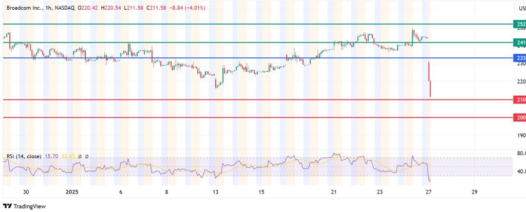 Broadcom stock price pivots at $233 and the momentum signals bearish control. Immediate support will likely be at $225. With the sellers in control, AVGO will likely find the first support at $210. However, and extended downward momentum could break below that level and test $200.