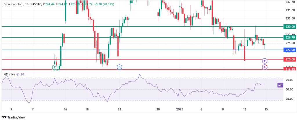 The momentum on Broadcom stock price calls for further upside if action stays above $222.90. With the buyers in control, AVGO price will head higher and likely encounter the first resistance at $226.70. However, the stock could break that barrier if the upward momentum strengthens, potentially extending gains to test $230.00.