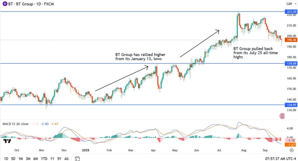 BT Group (LON: BT.A) has quietly staged an impressive rally. From the January trough near 135p, shares climbed to 223p by July, marking multi-year highs. The move has since cooled, with the stock consolidating around 195-200p.