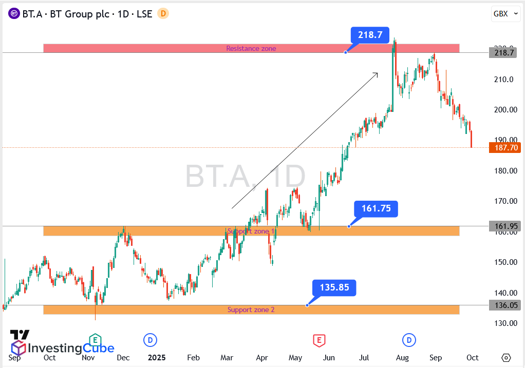 - BT share price hovers near 187p after summer highs. Key support sits at 187p , resistance 218p as fibre rollout and regulation shape outlook.