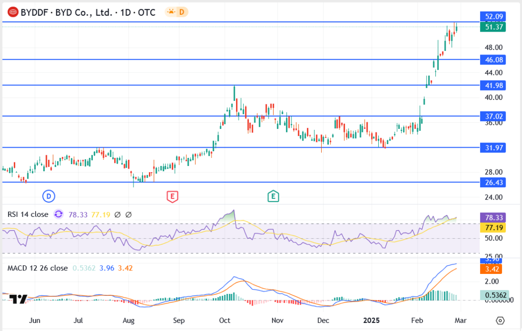 BYDDF stock has been on an impressive rally, breaking through multiple resistance levels as investor confidence surges. The recent bullish momentum suggests further upside potential, but overbought conditions could lead to short-term pullbacks.