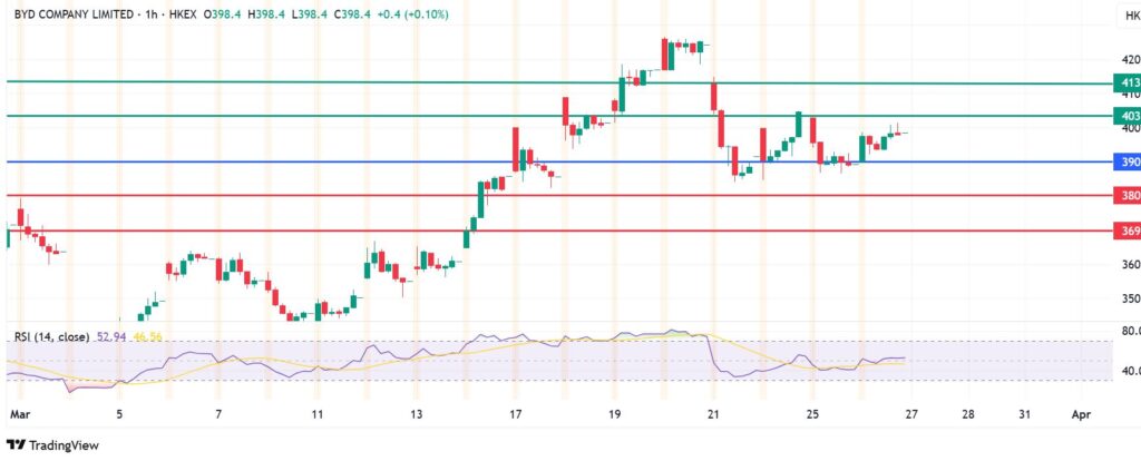 BYD stock price pivots at HK$ 390 and the momentum calls for further upside. The stock will likely meet initial resistance at HK $403. A stronger momentum will break above that level and test the second resistance at HK$ 413.