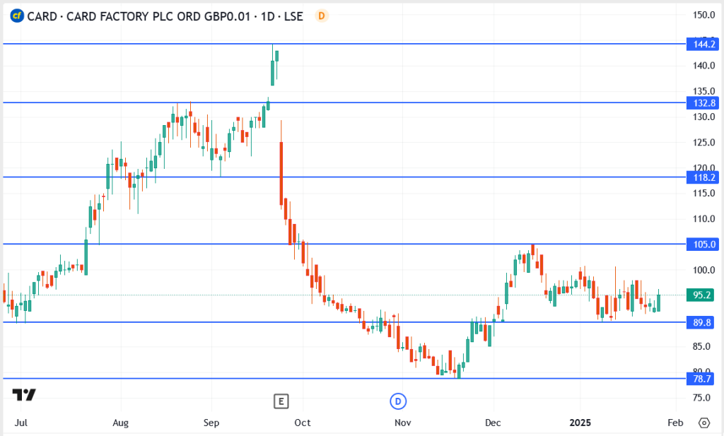 Card Factory (LON: CARD) shares traded around 95.2p on Monday, holding within a narrow range as investors assess the company’s resilience in a challenging retail environment. The stock has had difficulty building momentum following a robust recovery from its late 2024 lows, with resistance emerging around 105p and support remaining solid at 89.8p.
