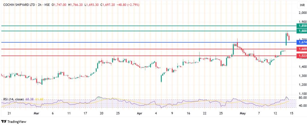 Cochin Shipyard share price pivots at Rs 1,674 and the momentum calls for upside. With the buyers in control, the stock will likely edge higher and meet its first resistance at Rs 1,800. An extended control by the buyers will break above that level, setting the stage for further gains to test Rs 1,858.