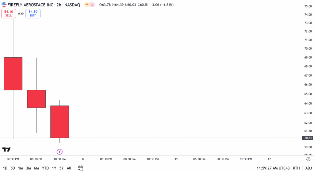 Firefly Aerospace’s (NASDAQ: FLY) shares came under pressure on Friday morning, extending the pullback that began late on its debut session. The stock fell 4.81% to $60.51 as of writing, sliding further from Thursday’s intraday highs near $70 as early IPO euphoria gave way to profit-taking and technical selling.