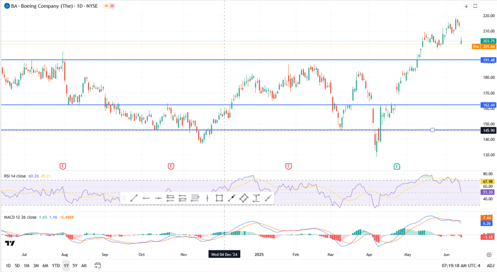 From a technical standpoint, Boeing stock broke below the $210 zone, confirming weakness in momentum. The next major support lies at $191.48, a critical level from April’s breakout structure. A deeper pullback could expose the stock to $162.44, especially if broader sentiment sours during the Paris event.
