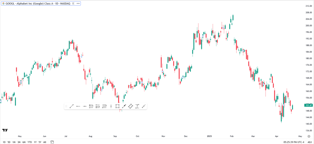 Google traded at $ 151 down from $205 in February .The sell-off in Alphabet stock mirrors broader weakness across mega-cap tech, as traders brace for Q1 earnings and updates on AI-driven monetisation and cloud business momentum.