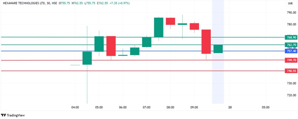 Hexaware share price pivots at Rs 757.40 and action above that level will signal control by the buyers. The stock will likely move higher and encounter the first resistance at Rs 762.70. However, a stronger upward momentum could break above that level and potentially test Rs 768.90.