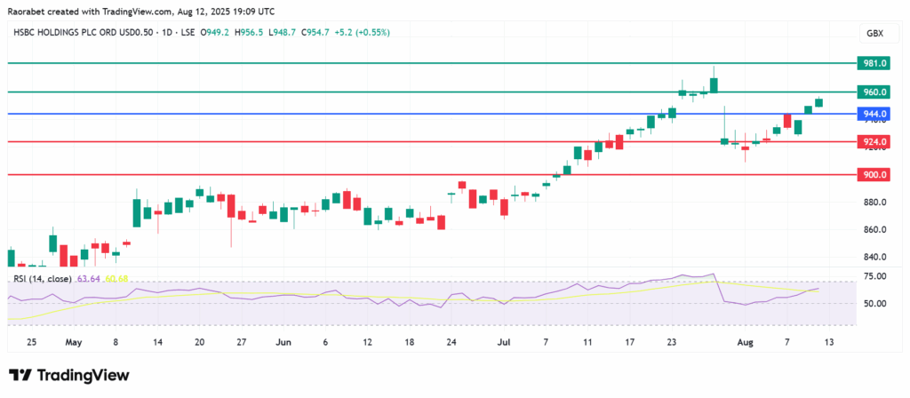 The momentum on HSBC share price signals control by the buyers above 944p. The stock will likely find initial resistance at 960p. Breaking above that level will signal a stronger momentum that could translate to further gains and test 981p.