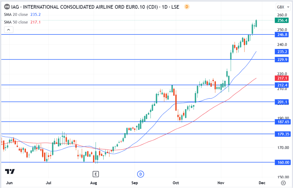 The daily chart illustrates a strong uptrend, with the IAG share price firmly above its 20-day SMA (235.2p) and 50-day SMA (217.1p). The moving averages indicate sustained bullish momentum, providing key support levels for traders.