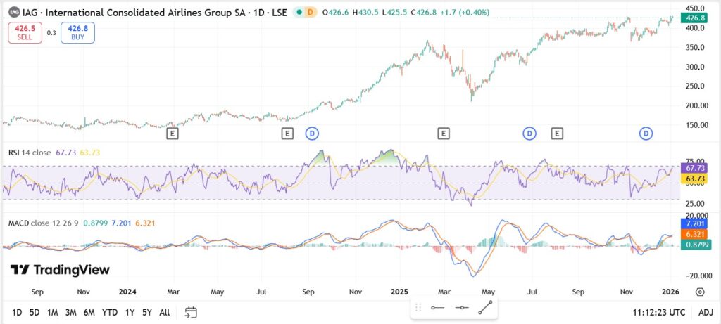 The daily chart shows IAG holding comfortably above all major moving averages, confirming the strength of the prevailing uptrend. Price action remains constructive after consolidating below the 430p resistance zone, with higher lows preserved throughout the second half of 2025.