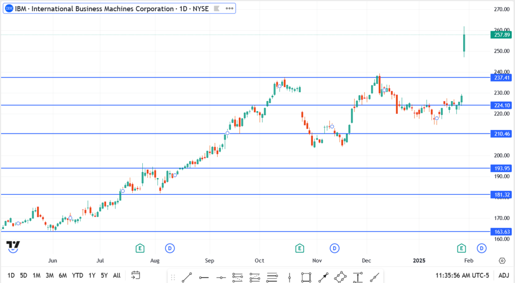 With a strong earnings beat and bullish market reaction, IBM is well-positioned to extend its rally in 2025. However, traders will be watching whether the stock can hold above $250 in the coming sessions, as profit-taking could introduce some near-term volatility. For investors, IBM’s AI and cloud expansion strategy continues to pay off, making the stock an interesting play amid the broader tech rally.