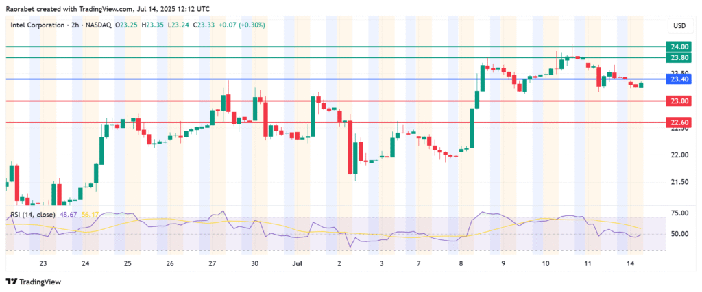 Intel stock price pivots at $23.40 and the downside will prevail if action stays below that level. The stock will likely find initial support at $23.00. If the price breaks below that level, the momentum could send the action lower and test the second support at $22.60.