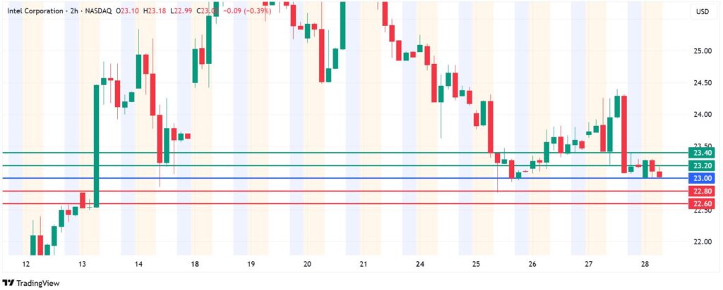 Intel stock price pivots at $23.00 and action above that level signifies control by the buyers. The first barrier is likely to be at $23.20, but an extended upward momentum will break above that level and potentially test $23.40.