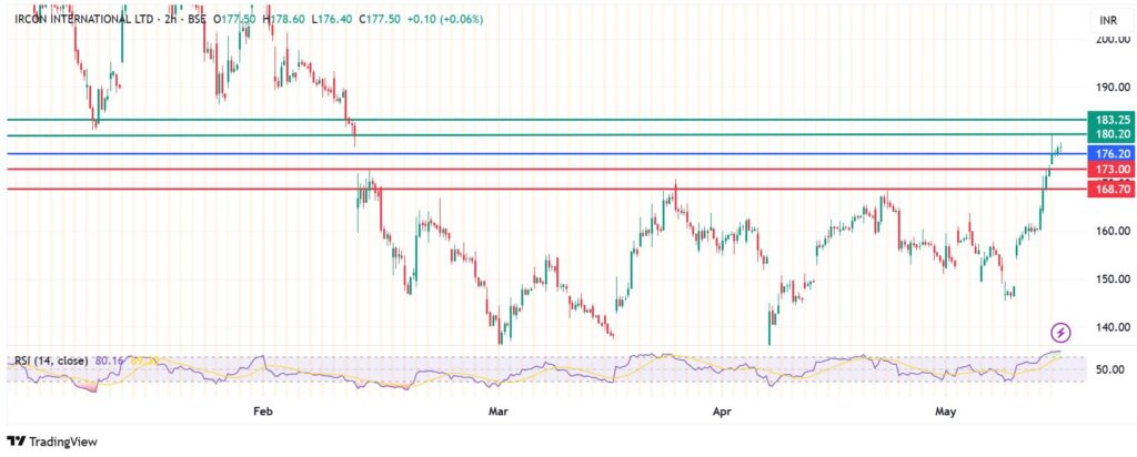 Ircon share price pivot mark is at Rs 176.20 and the upside will likely continue if action stays above that level. That momentum will likely meet initial resistance at Rs 180.20 However, an extended control by the buyers will clear that hurdle and potentially take the stock higher to test Rs 183.25.