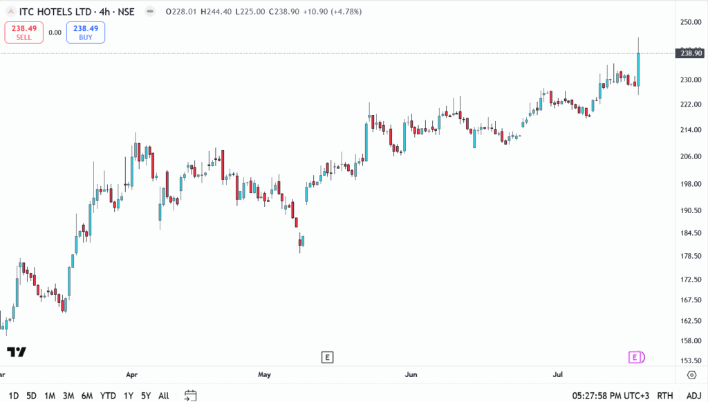 ITC Hotels Ltd (NSE: ITC) surged nearly 5% on Tuesday, with the stock closing at ₹238.90 after a sharp rally triggered by its Q1FY26 earnings beat. The company’s net profit jumped 53% year-on-year to ₹133.71 crore.
