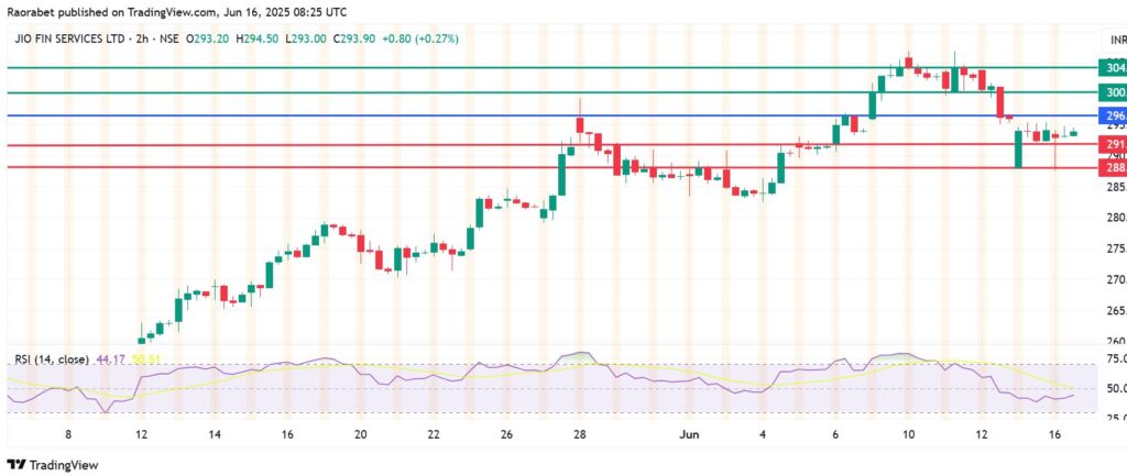 Jio Finance share price pivots at Rs 296 and action below that level calls for further downside. The stock will likely find initial support at Rs 291. However, an extended control by the sellers will break below that level and potentially send the action lower to test Rs 288.