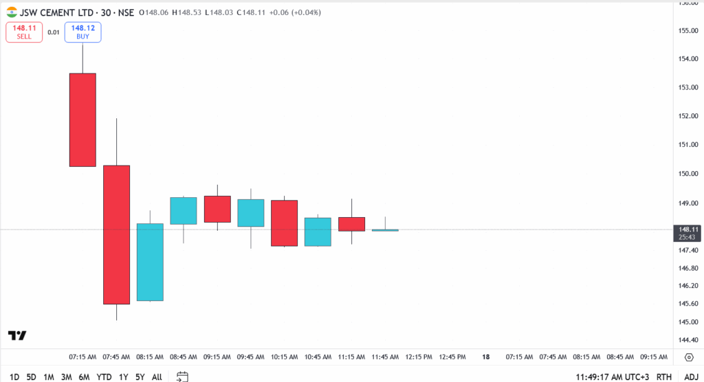 JSW Cement opened to a quiet tape, trading around ₹148 in early sessions as day-one profit-takers met long-only interest. The reception was cautious rather than cold: quick selling hit the first candle, then price flattened as bids built just above ₹147. The read is simple, traders want proof of post-listing follow-through before they chase.