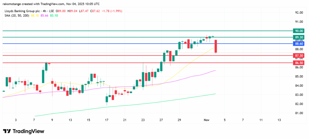 Lloyds Bank share price chart on November 4,2025 with key near-term support and resistance levels. Source: TradingView