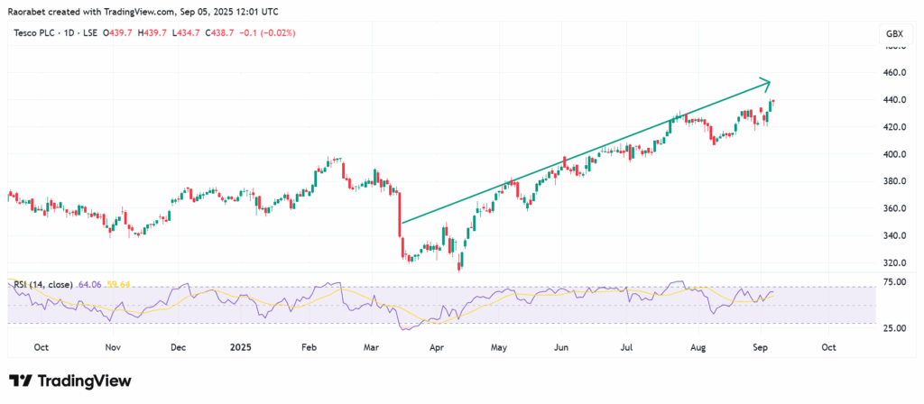 Tesco stock price action on the daily chart showing strong gains since mid-March
