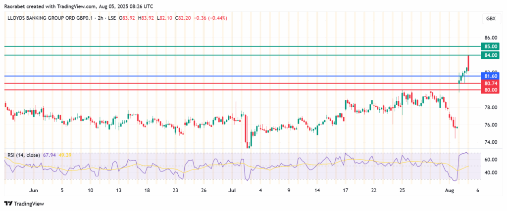 The momentum on Lloyds Bank share price favours the upside to continue above 81.60p. That will likely see initial resistance encountered at 84.00p. However, a stronger momentum will clear that barrier and potentially test 85.00p.