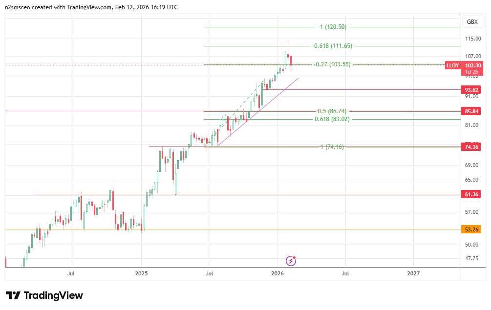 Lloyds’ share price remains in an uptrend. However, the appearance of a bearish pinbar candle and the subsequent bearish weekly candle that now tests a key support at 103.55 (27% Fibonacci extension of the 23 June 2025 – 1 December 2025 upswing) brings concerns that the trend may be nearing exhaustion.