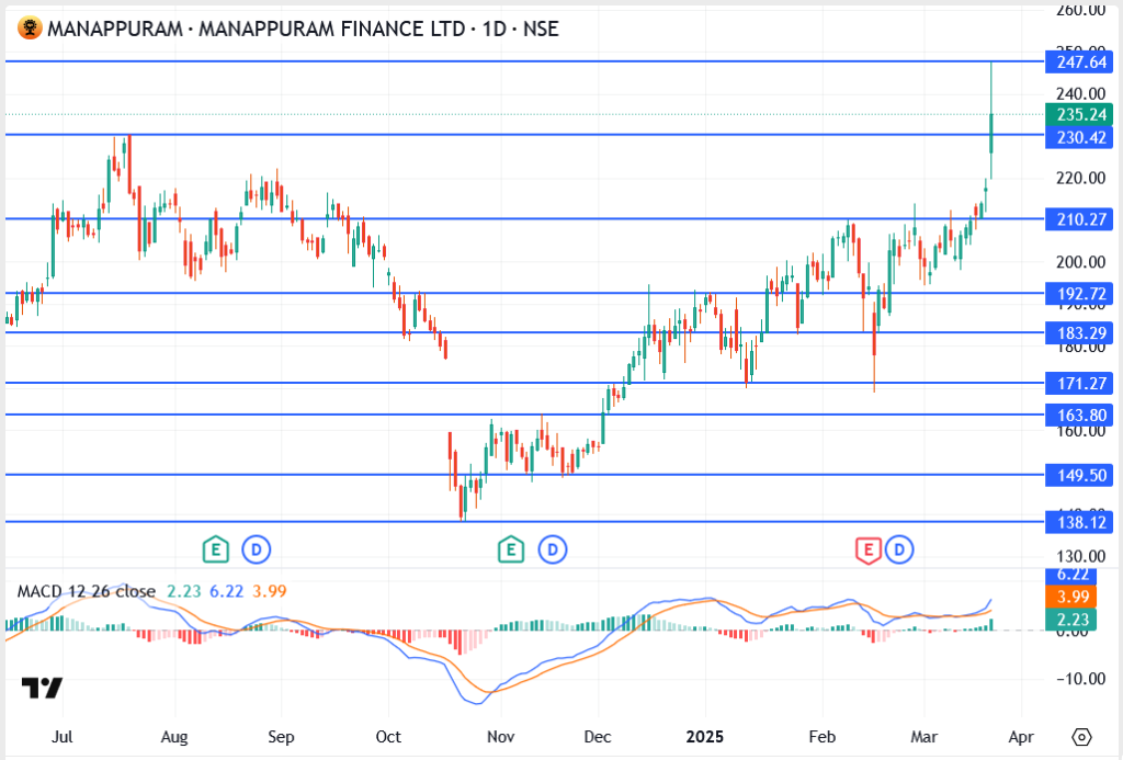 However, if a correction sets in, ₹230 and ₹210 will be crucial to watch. With strong sector momentum, a growing gold loan market, and institutional backing, Manappuram Finance could be a stock to watch for continued upside!