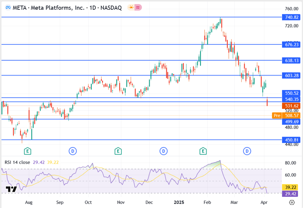 At the same time, concerns over slowing ad revenue in Q1 and a cooldown in AI-related hype have raised questions about Meta’s near-term growth. The break below the key $550 support level technically intensified the selloff.