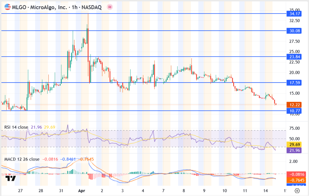 MicroAlgo Inc. (NASDAQ: MLGO) is back under pressure, with shares dipping to $12.22 in Monday’s session. The short-term outlook has turned bearish after a slow bleed from the $17.59 resistance level earlier this month, with price action now flirting dangerously close to the $10.77 support zone.