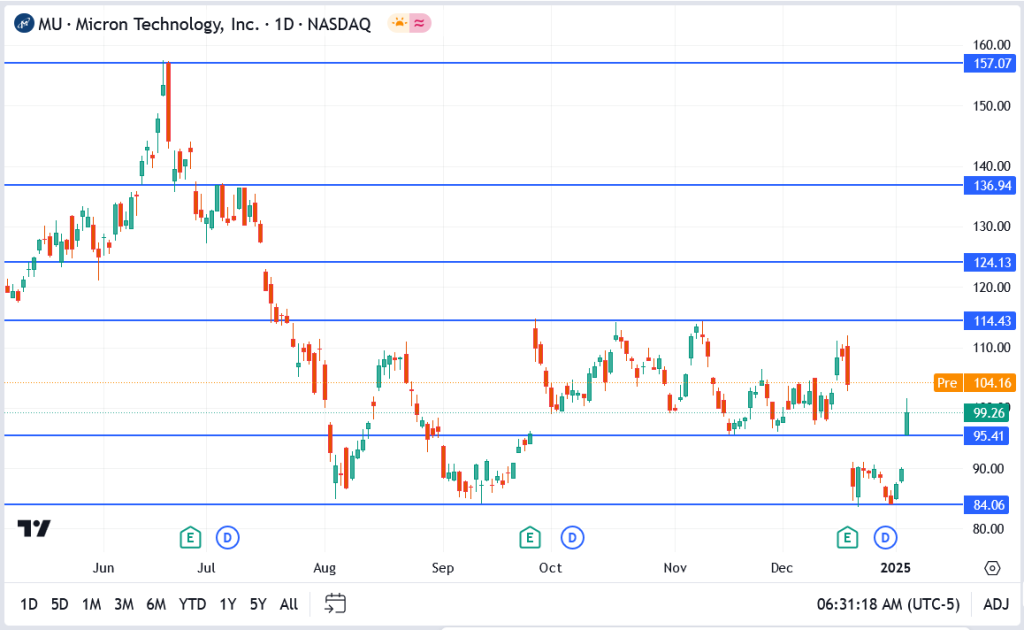 Micron’s share price currently trades at $104.16, marking a significant recovery from its lows in December 2024. Here are the key levels to monitor: