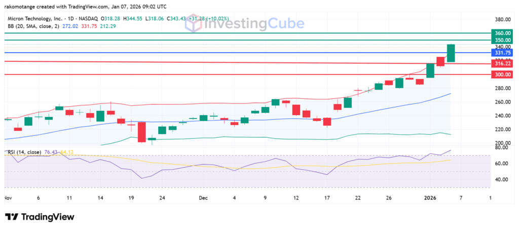 Micron Technology stock is currently displaying parabolic characteristics. The Relative Strength Index (RSI) is at 76, a clear signal that the stock is technically overbought in the short term. The next resistance zone is psychological at the $350-$360 level, while firm support sits at $316 at the previous breakout point and more substantially at the psychological $300 mark.