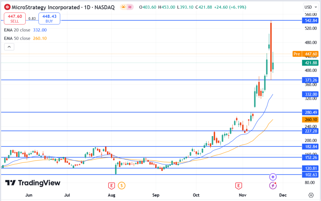 Current Price: MicroStrategy is trading at $421.88, reflecting a strong recovery.