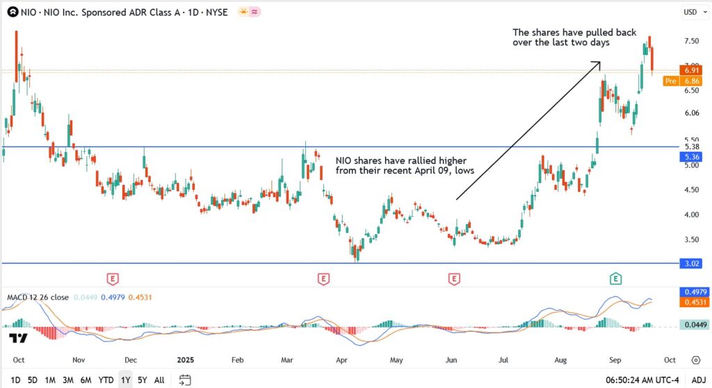 NIO (NYSE: NIO)‘s chart has been nothing short of explosive. From the April lows near $3.00, the stock has more than doubled, punching through the $5.36 ceiling that capped it for months. That breakout in September lit a fire under the shares, carrying them to just above $7.50 before sellers finally stepped in.