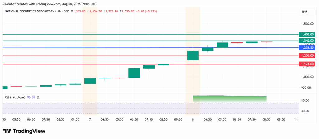 NSDL share price pivot mark is at ₹1,275 and the momentum will favour the upside to prevail above that level. The stock will likely rise and meet initial resistance at ₹1,340. Breaking above that level will signal a stronger momentum that could push the stock higher and test the second barrier at ₹1,400.