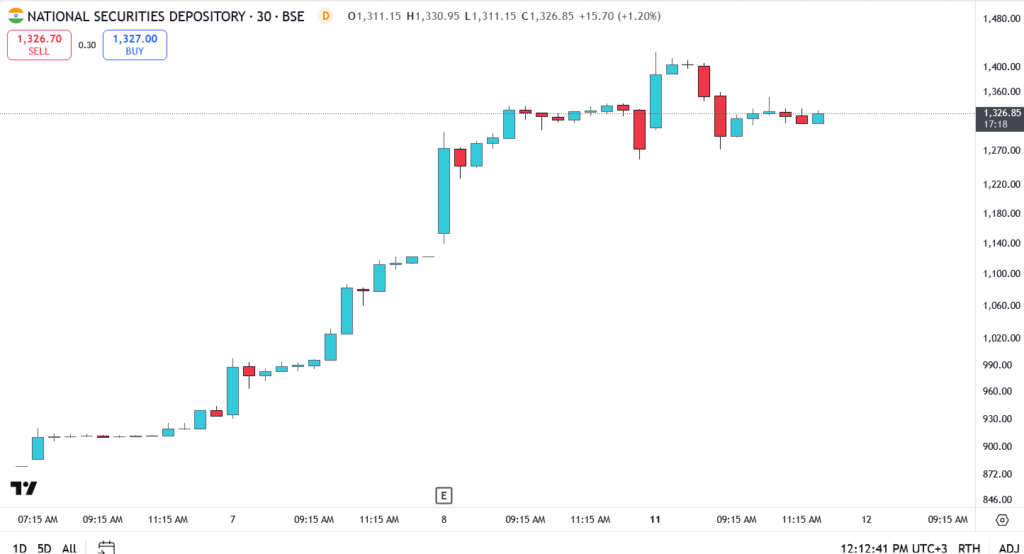 The NSDL share price extended its winning streak on Monday, climbing another 1.20% to ₹1,326.85 in afternoon trade. The move builds on an extraordinary post-IPO surge that has already delivered more than 80% gains to early investors, cementing NSDL’s position as one of the year’s strongest market debuts.