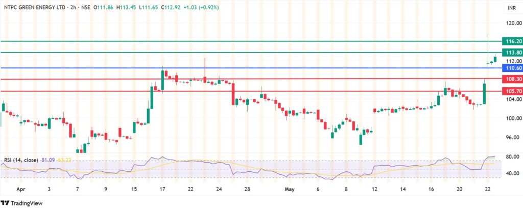 On the chart below, the momentum on NTPC Green share price calls for further upside above Rs 110.60. Control by the buyers will likely push the stock to encounter the first resistance at Rs 113.80. However, a stronger momentum will breach that barrier and potentially test Rs 116.20.