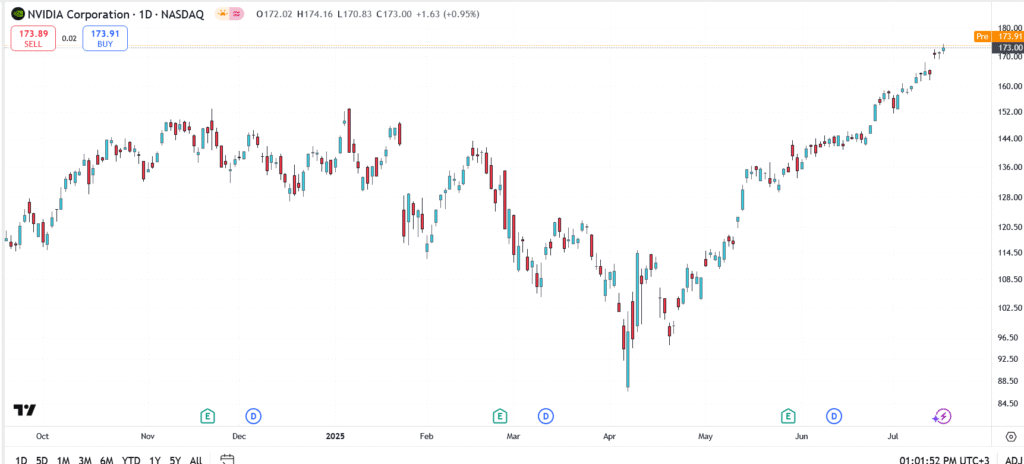 Traders are now watching for any updates on upcoming earnings guidance, as well as delivery timelines tied to new geopolitical trade channels. With bulls firmly in control, Nvidia’s share price may not stop at $180, especially if the AI narrative continues to accelerate through Q3.