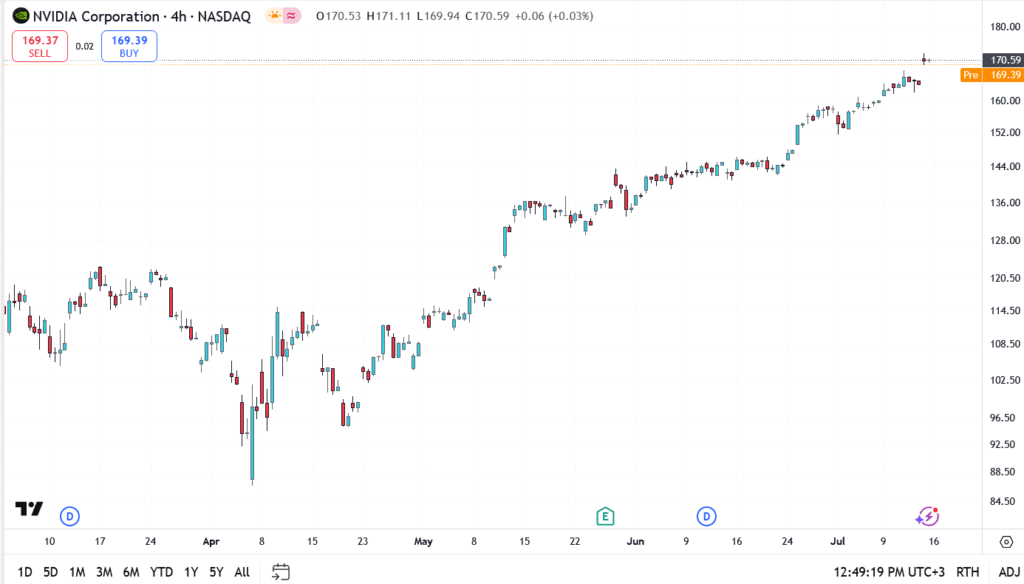 Nvidia share price traded slightly higher on Tuesday afternoon, hovering near $170.59 after a strong open that briefly pushed the stock above $171. The move follows reports that China has resumed limited chip imports from U.S. firms, including Nvidia, as part of a broader de-escalation under the new trade agreement.