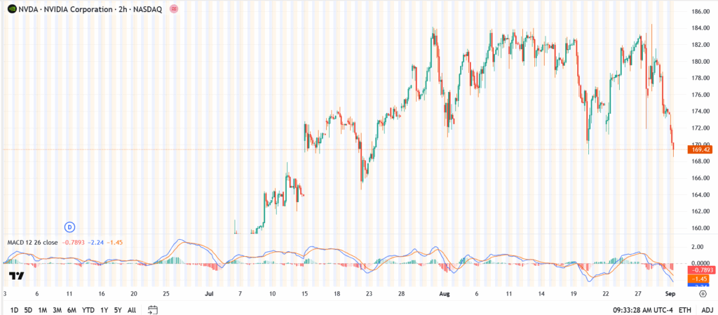 Nvidia (NASDAQ: NVDA) tumbled to $169 in Tuesday’s trade, breaking below its short-term support zone as surging U.S. bond yields spooked investors across the tech sector. The drop adds to last week’s post-earnings weakness and raises questions about whether the AI leader can quickly regain its footing in a market turning cautious.