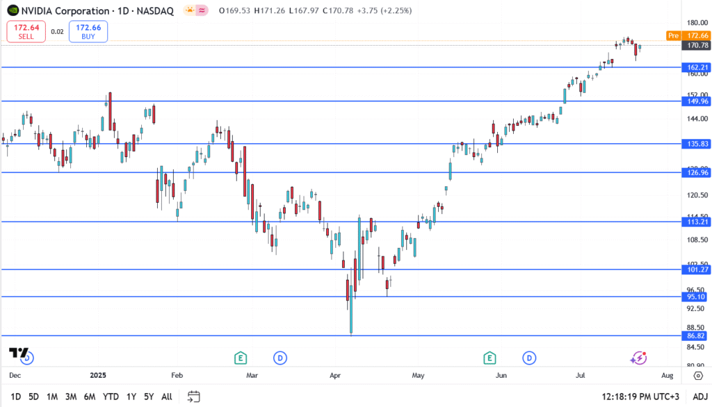Nvidia (NASDAQ: NVDA) is up 1.2% in pre-market trading on Thursday, July 24, 2025, building on its remarkable summer rally as investors pile back into AI-heavy tech stocks. The stock closed Wednesday at $170.78 and is now trading at $172.66 pre-market, just below key resistance levels. With earnings due in under a month, Nvidia’s momentum is once again being driven by macro-level AI optimism and strong signals from its global supply chain.