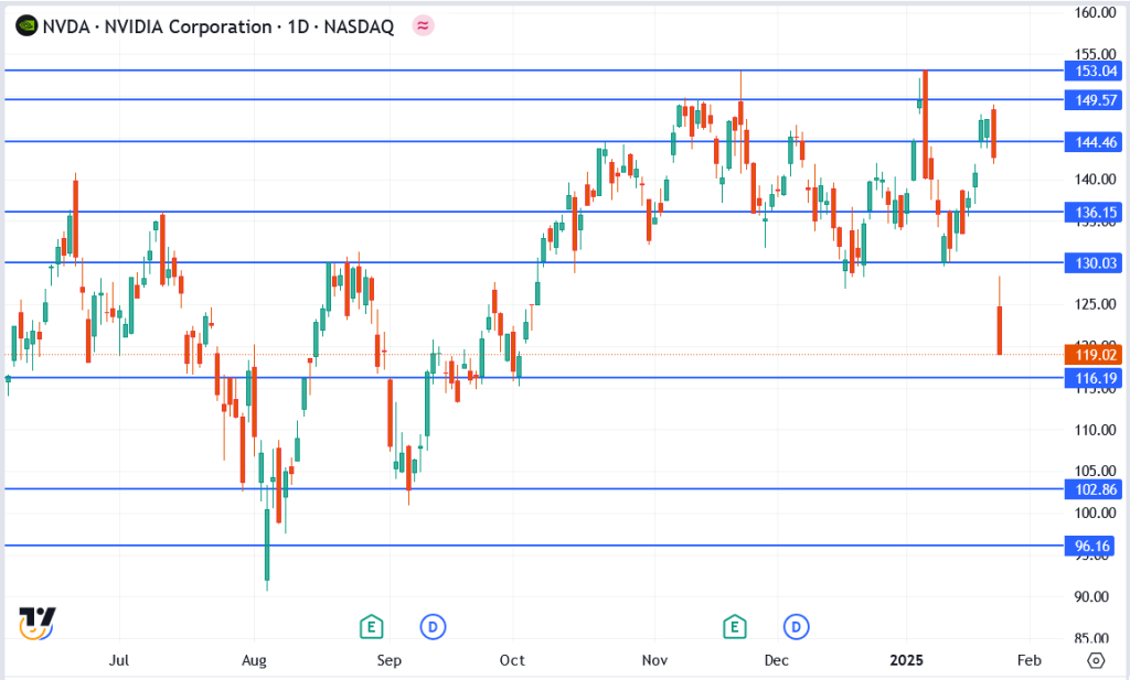 NVIDIA’s sharp drop reflects the growing uncertainty in the AI space as competition heats up. With DeepSeek AI threatening to disrupt the status quo and NVIDIA’s reliance on China facing challenges, the stock’s outlook has become increasingly uncertain.