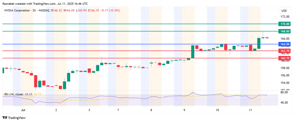 Nvidia stock price momentum signals control by the buyers above $164. That will likely see the first resistance come at $168.00. If the buyers extend their control, the price will break above that level and potentially test $170.