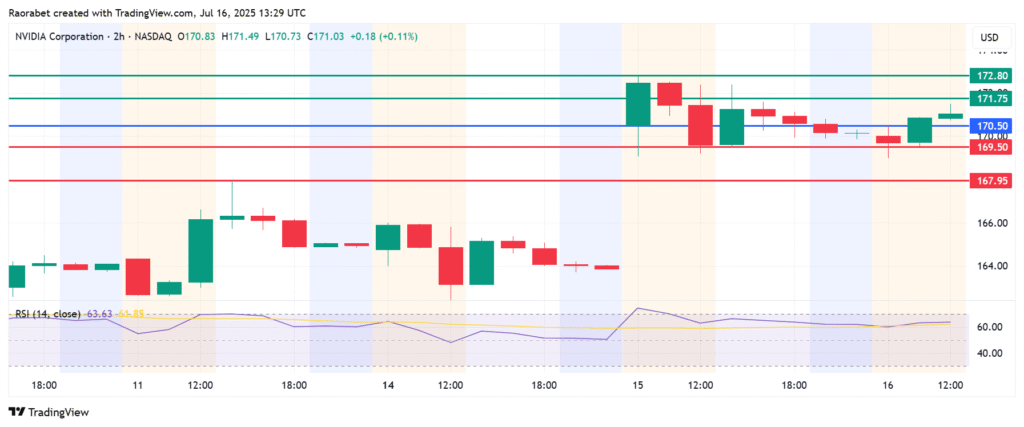 Nvidia stock price pivot mark is at $170.50 and the momentum calls for further upside. With the buyers in control, immediate resistance will likely be at $171.75. However, a stronger momentum will break above that level and potentially test $172.80.