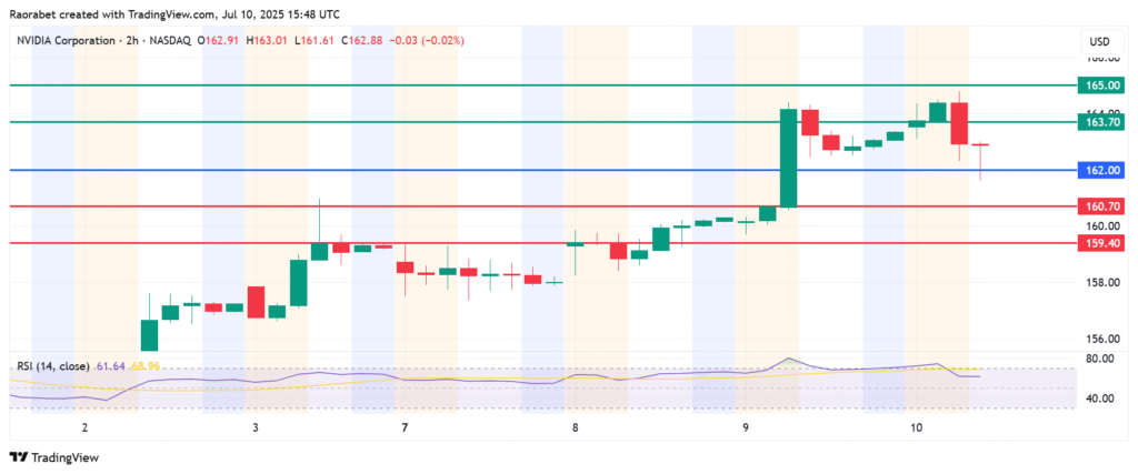 Nvidia stock price pivots at $162 and action above that level will favour the upside to continue. With the buyers in control, the first resistance will likely be at $163.70. Breaking above that level will signal a stronger momentum that could push the action to test $165.00.