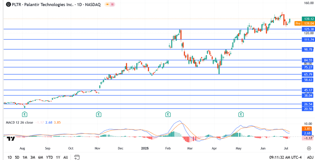Palantir is no longer a quiet defense tech play. It has repositioned itself as an AI-first platform with government and commercial data integration at the core. That’s fueled a rally from under $60 in January to nearly $140 today.