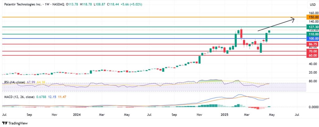The daily chart shows that the PLTR stock price has been in a strong bearish trend for months. It remains below the descending trendline shown in purple. The Relative Strength Index (RSI) indicator reading is at 67.99 on the weekly chart, affirming bullish control. Also, MACD is tilting upwards and is above the signal line.