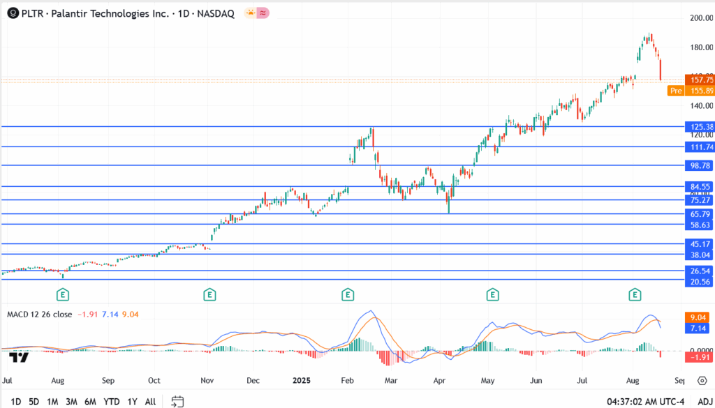 The correction doesn’t erase the bull story that powered Palantir into the $180s. AI contracts remain robust, and government pipeline visibility is improving. But at these heights, traders are weighing whether near-term valuations already reflect the good news. The $180 breakout quickly turned into resistance once momentum cooled, suggesting the market wants confirmation before rewarding further upside.