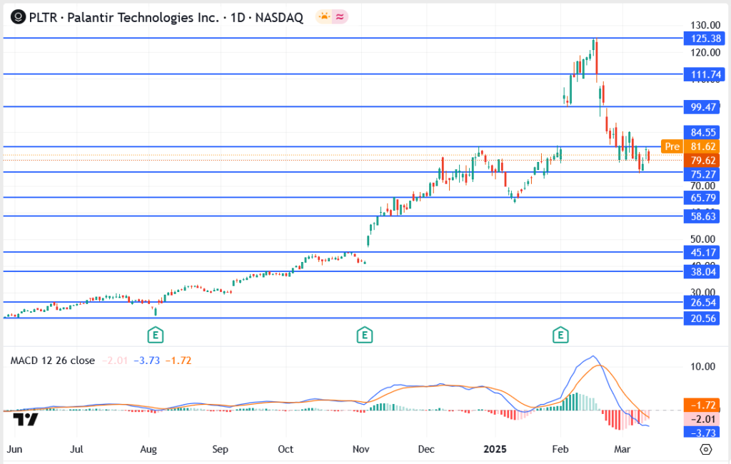 Palantir Technologies Inc. (NASDAQ: PLTR) has faced a significant correction in recent weeks, falling from its all-time high above $125 to a recent low near $75. The stock is now trading at $79.62, attempting to stabilize as investors digest the sharp pullback.