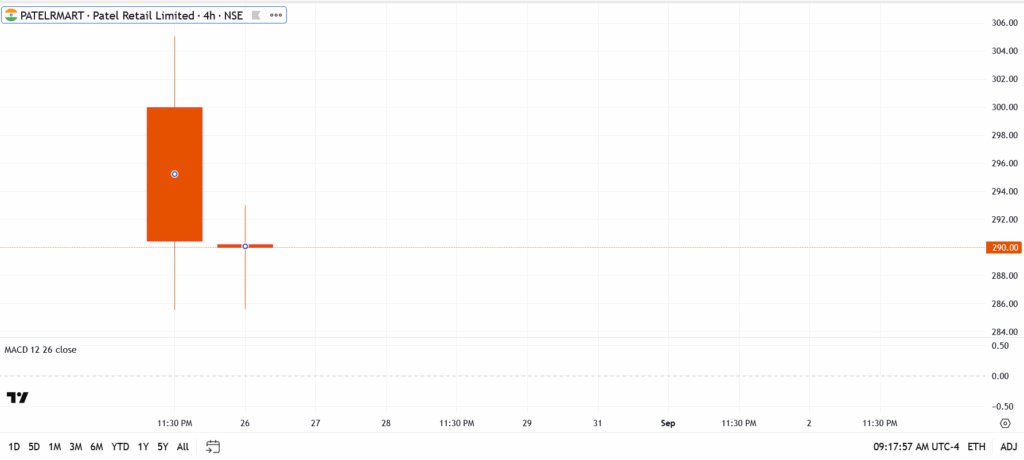 The stock’s first ticks told the story, a quick sprint to ₹305, nearly 20% above issue price, before supply kicked in. By afternoon, Patel Retail had slipped to an intraday low of ₹285.55, trimming much of its opening burst. It eventually settled around ₹290, still well ahead of its IPO price but short of the euphoria some retail bidders were hoping for.