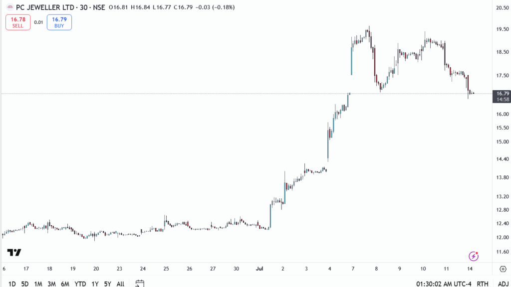 PC Jeweller (NSE: PCJEWELLER) extended Friday’s pullback on Monday morning, dropping 3% to ₹16.79. The drop comes just days after the stock surged to ₹19.80, marking a staggering 75% rally from late June lows. So why are investors hitting the brakes now, even as the company announces a big funding round and solid revenue growth?